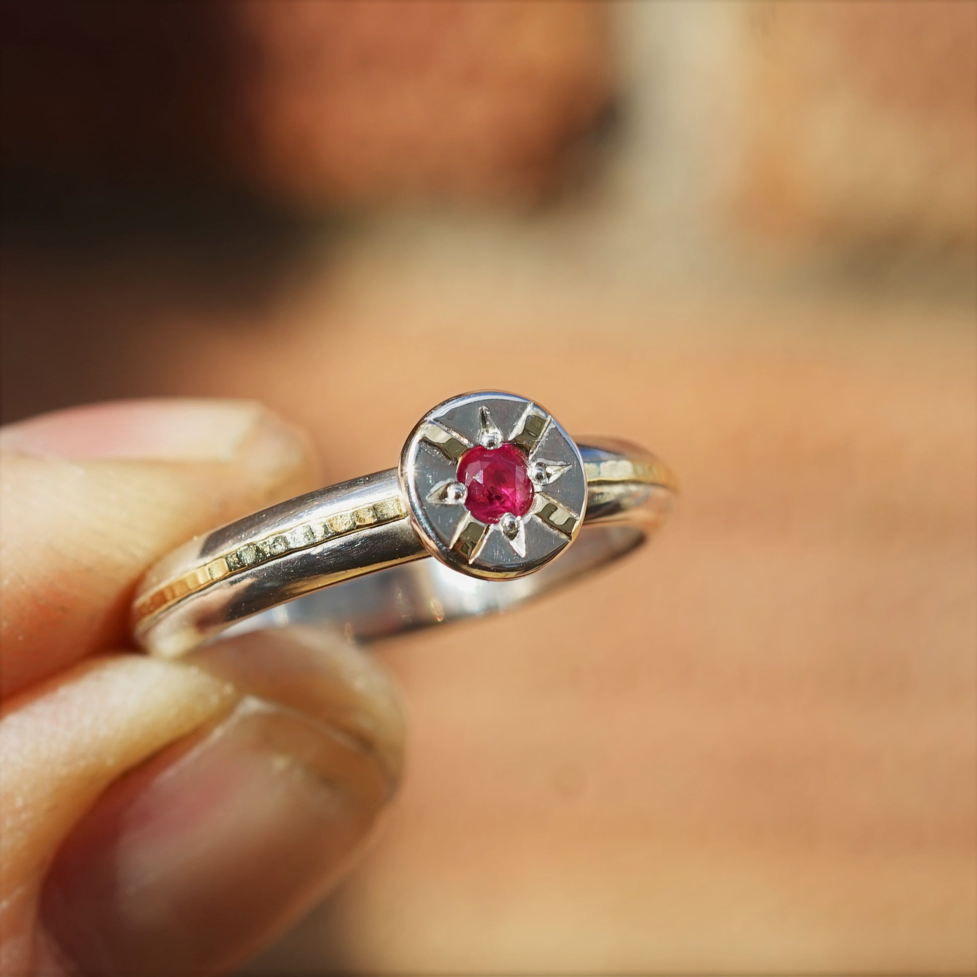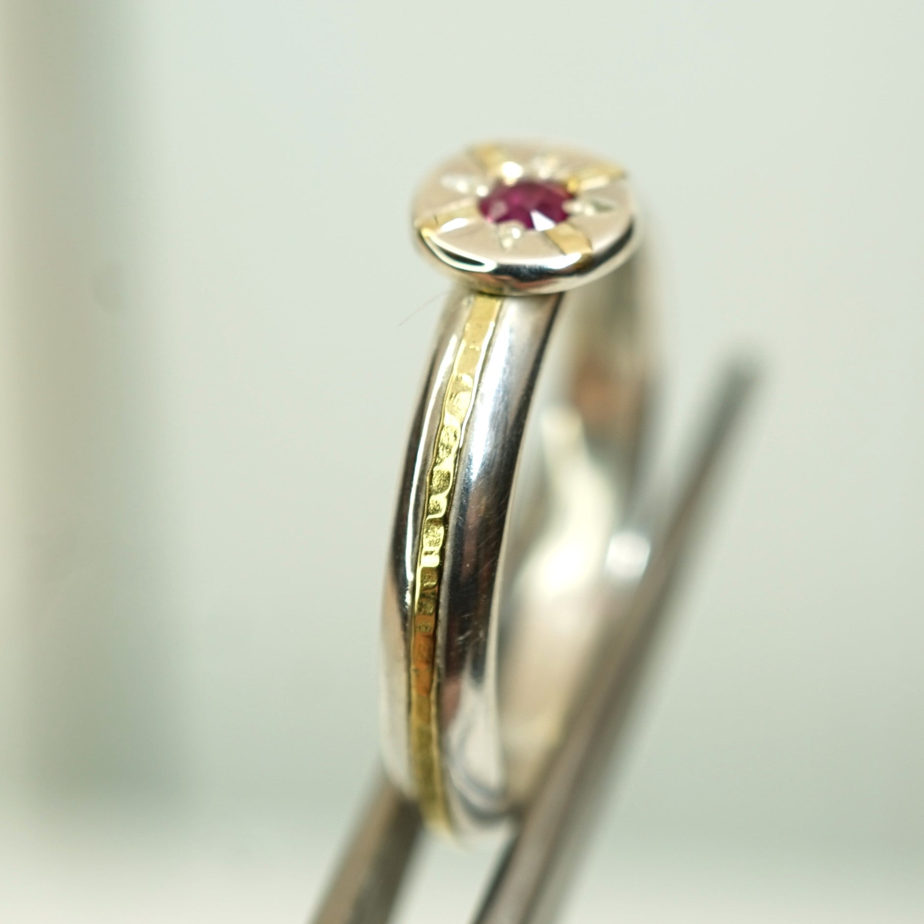 The gems is a Pink Ruby, 3mm and the ring is hand crafted by me, from 18ct gold and 925 Sterling Silver. I inlayed the silver with 18ct sold gold wire, then hammered it to create the texture.