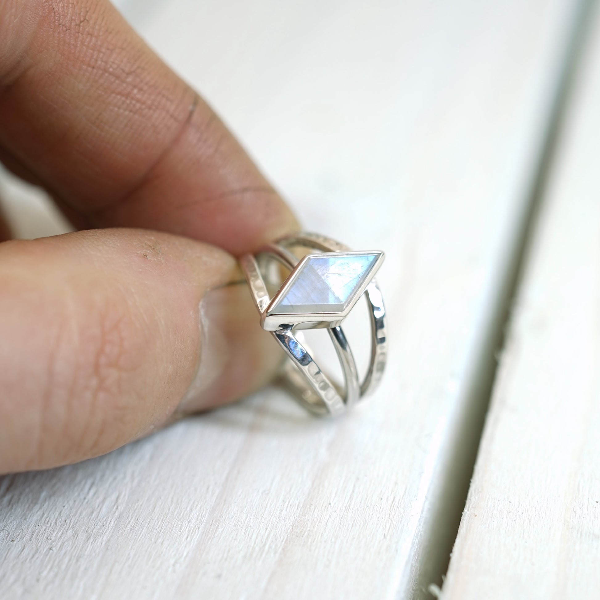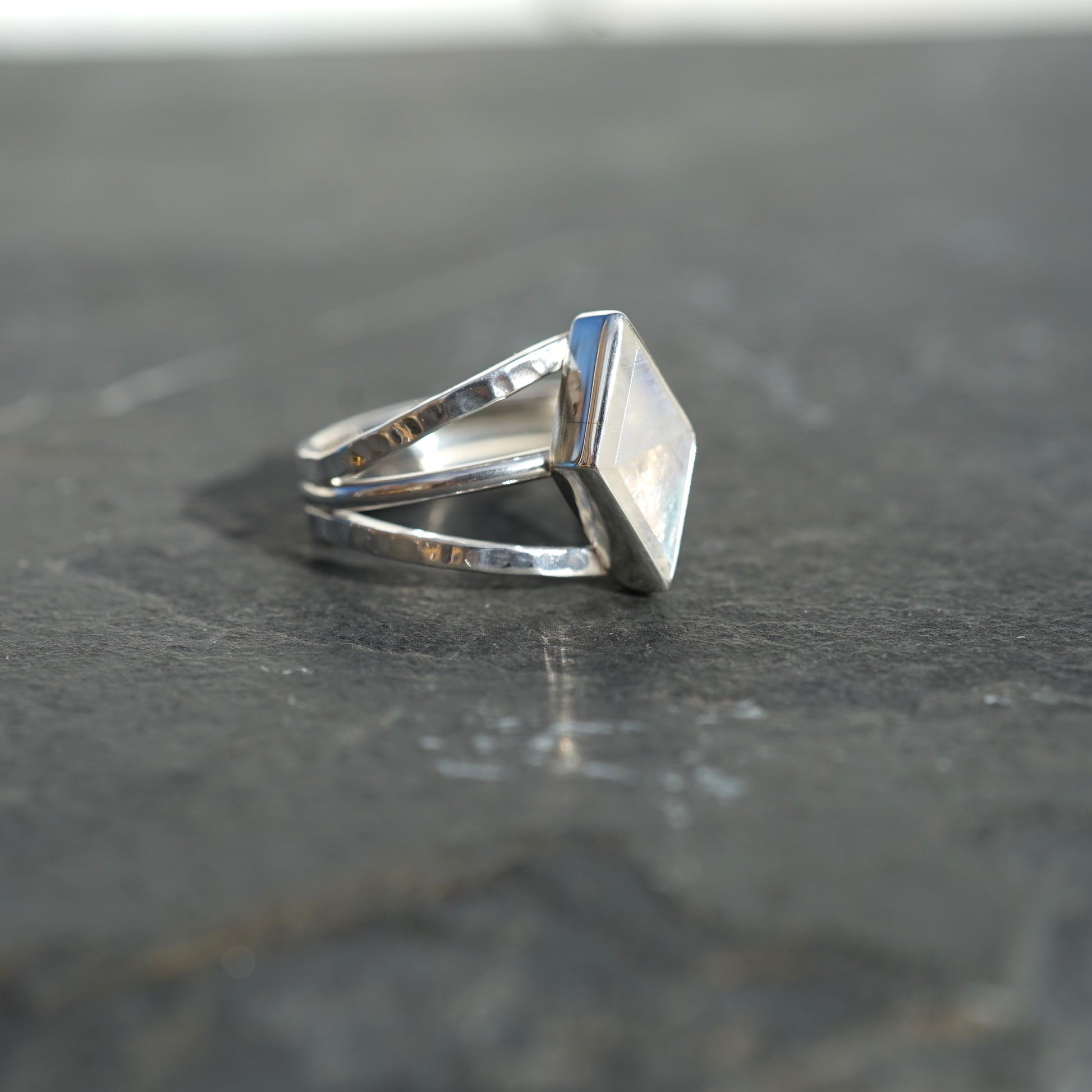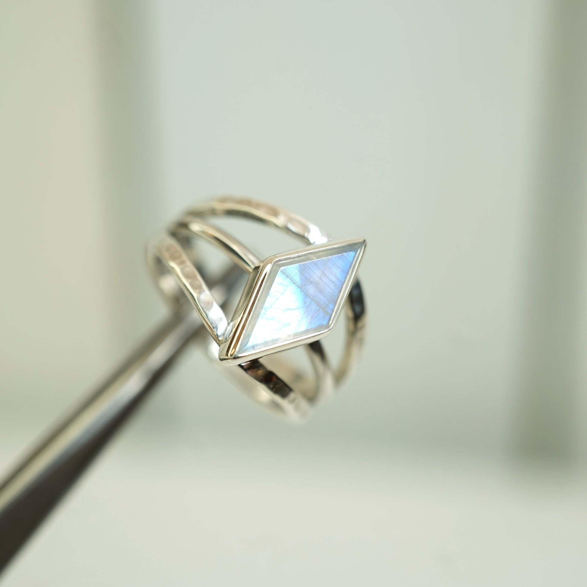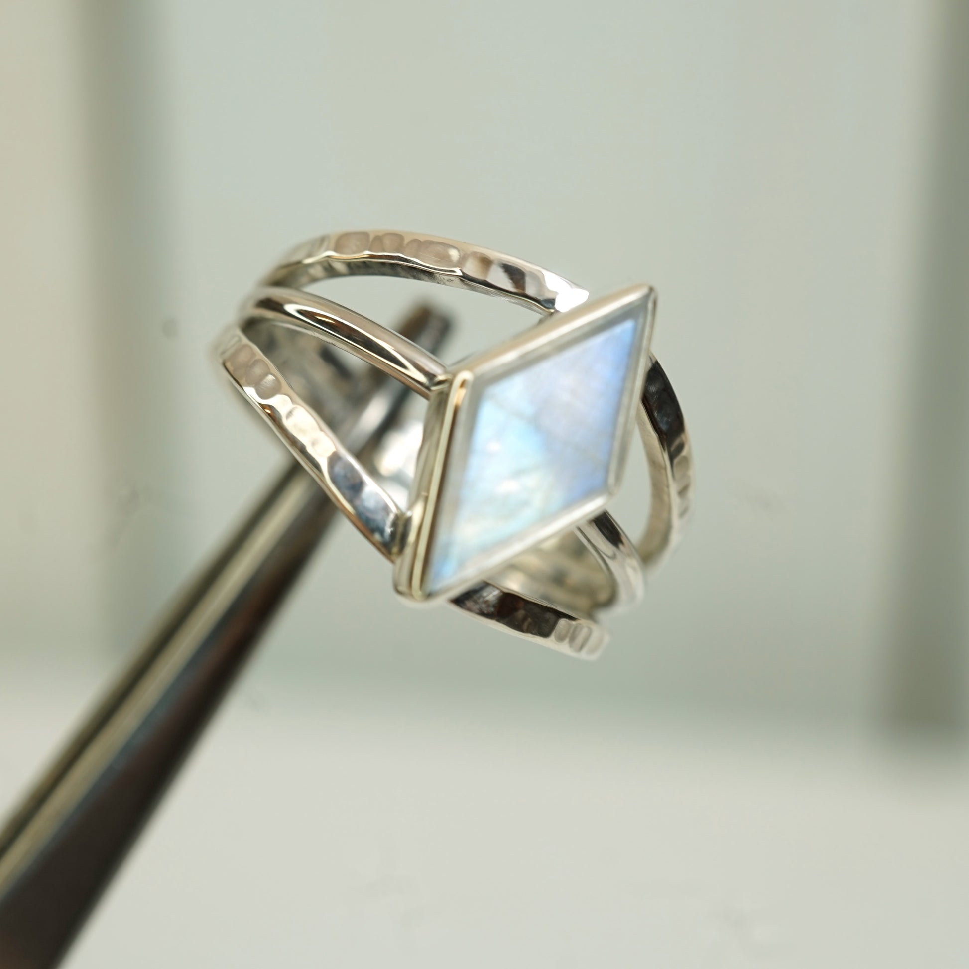 With its milky iridescence, dances with an inner glow reminiscent of moonlit nights. Its kite shape enhances the mystical charm, creating a harmonious fusion of celestial inspiration and artisanal craftsmanship. As light plays upon the surface of the moonstone, it reveals a mesmerizing play of colours—subtle blues and whites that evoke a sense of celestial tranquillity.