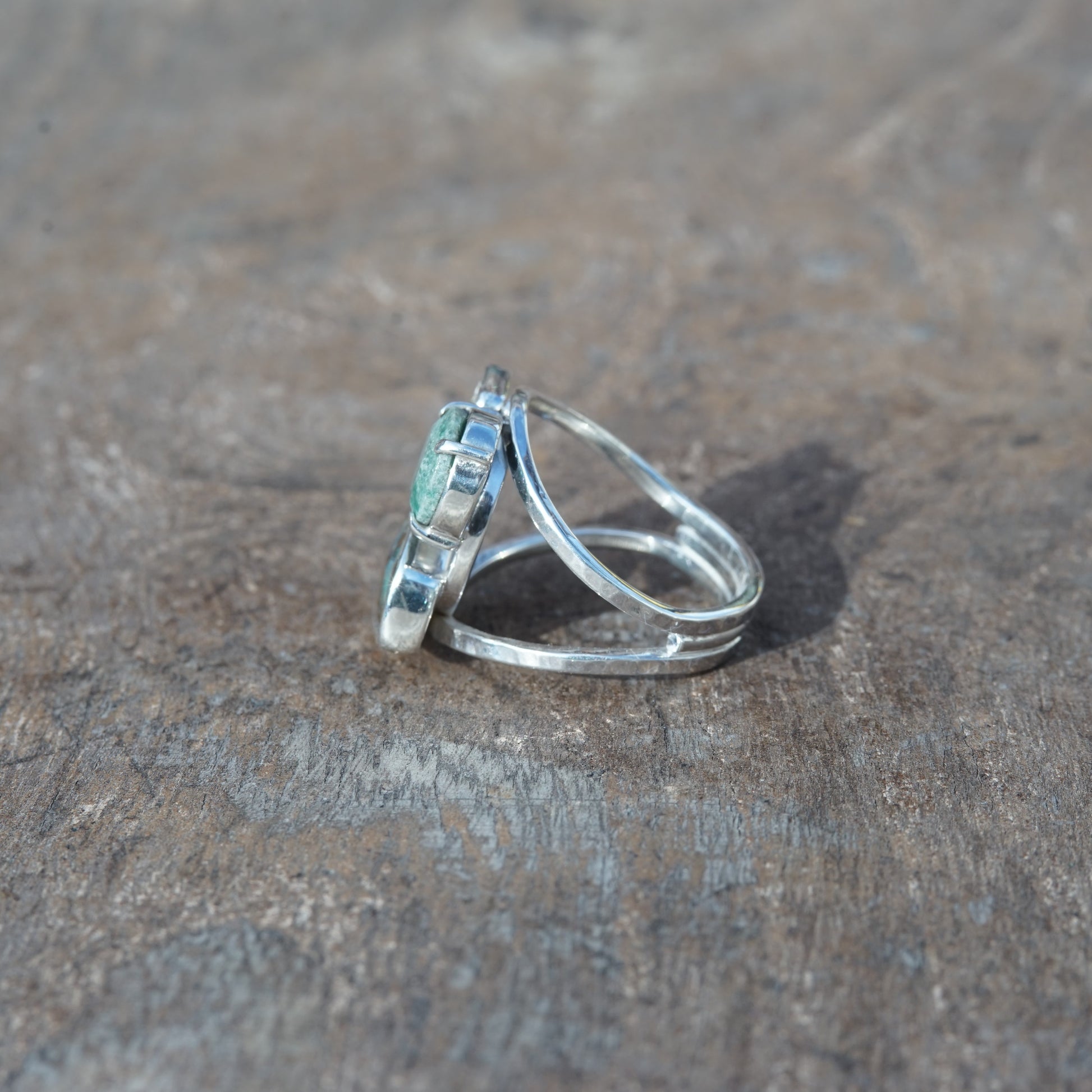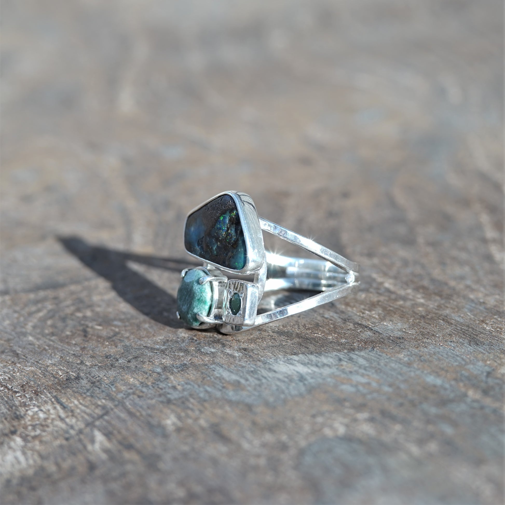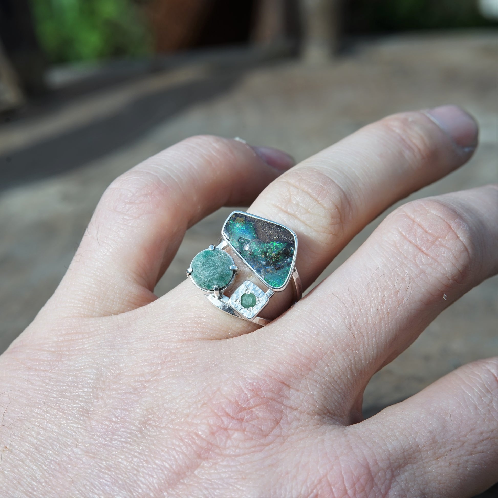 The gems are an amazing Australian Boulder opal and two beautiful Emeralds and the ring is handcrafted from 925 sterling silver.