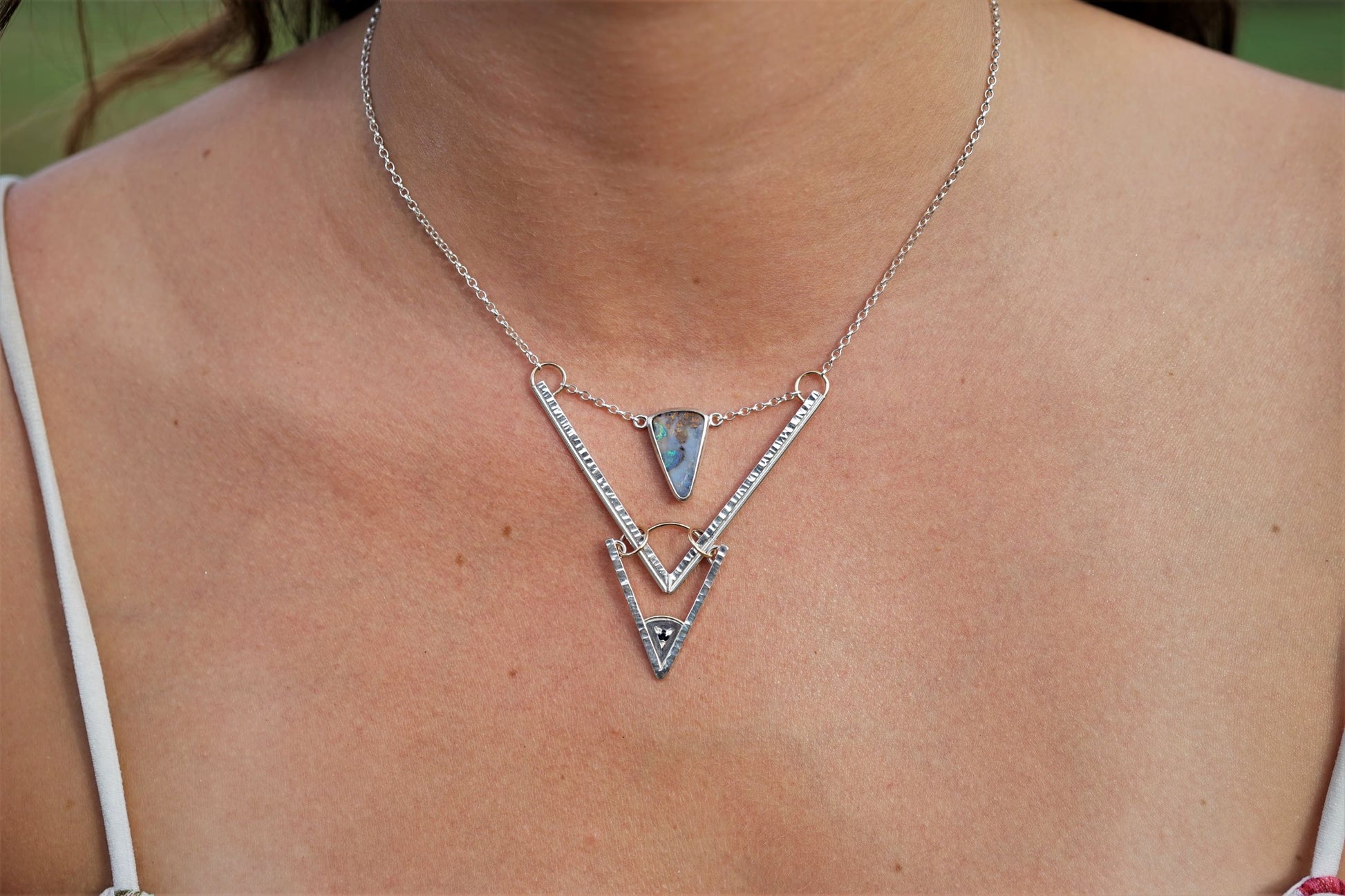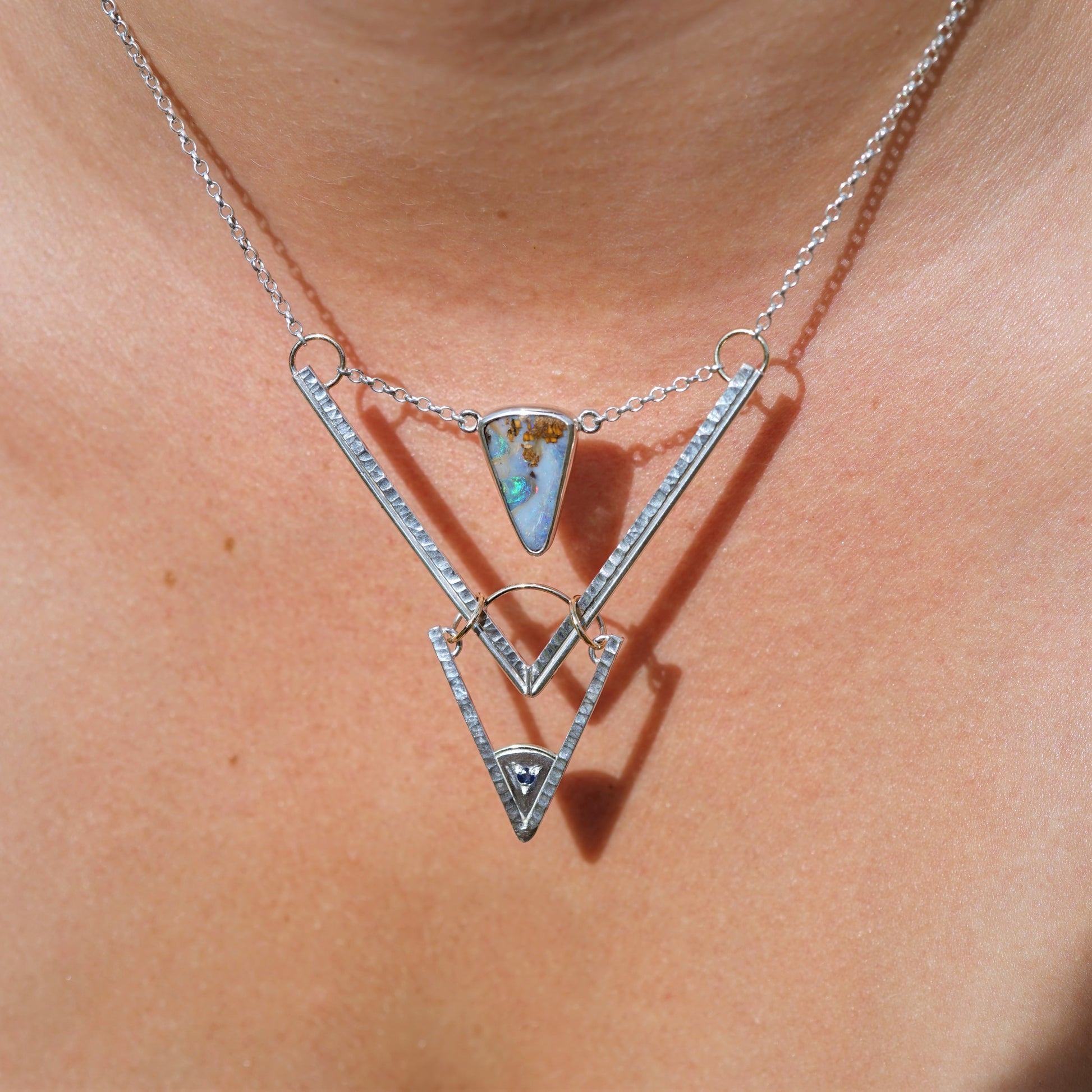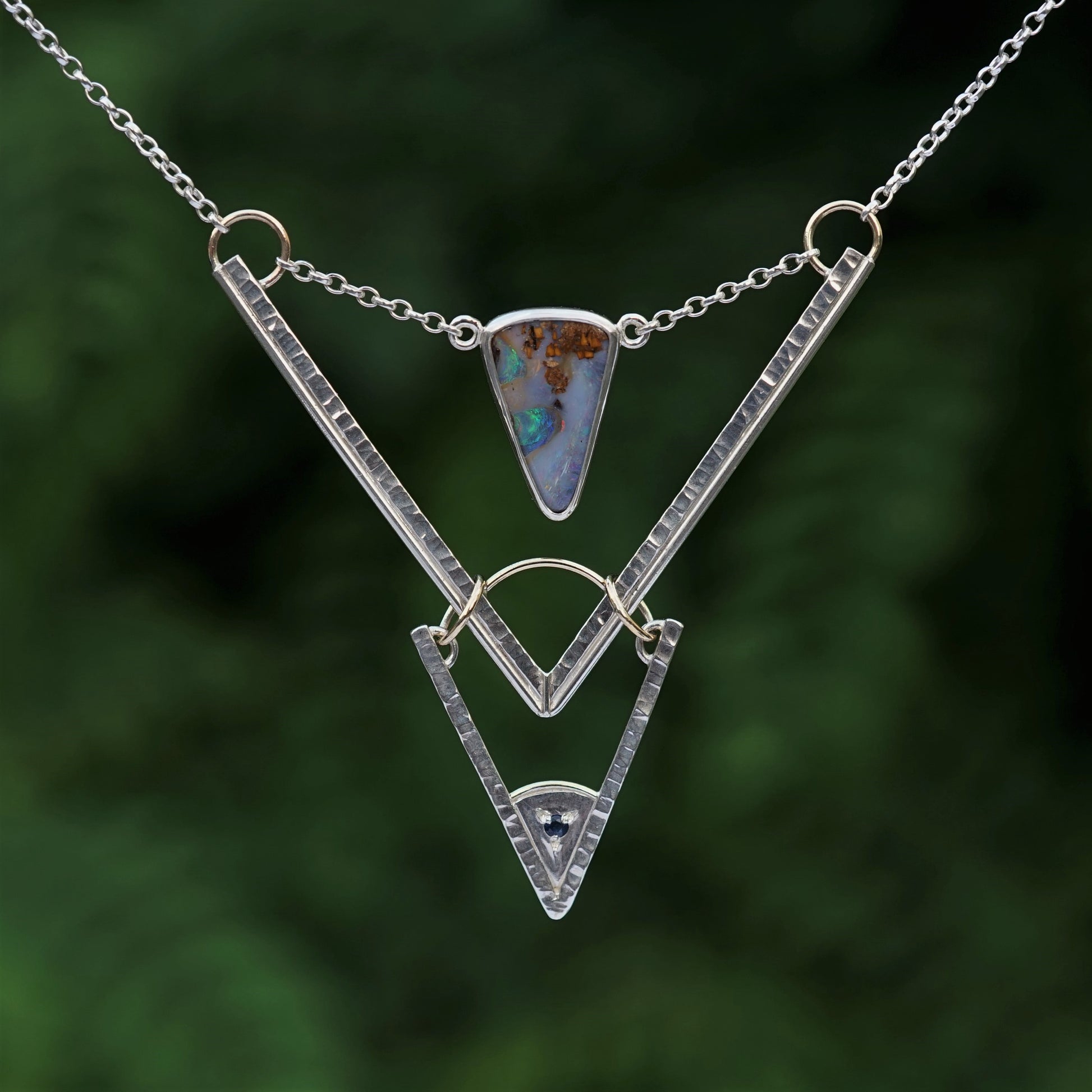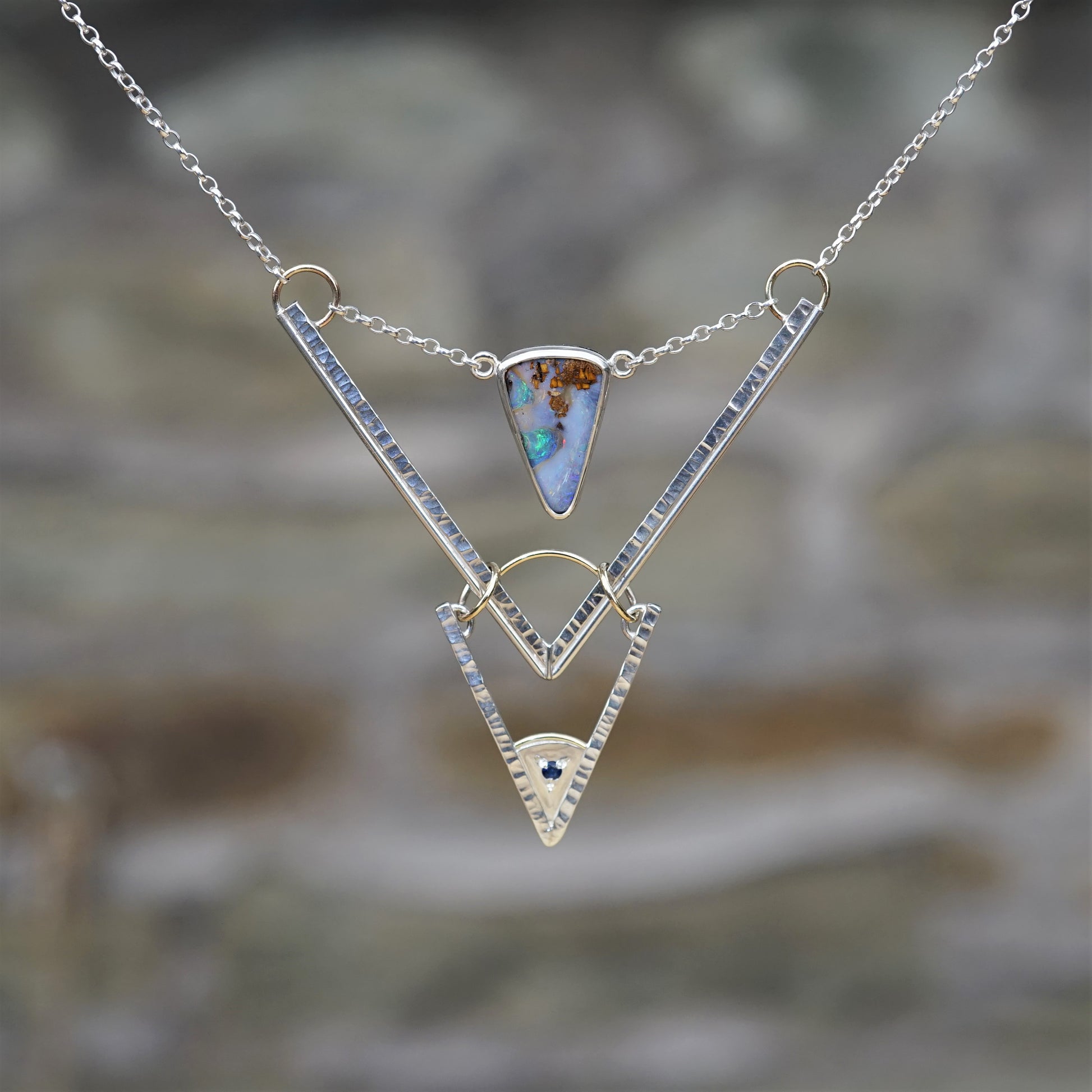 The gems are Australian Boulder Opal and Blue Sapphire and the pendant is handcrafted from 9ct gold and 925 sterling silver.