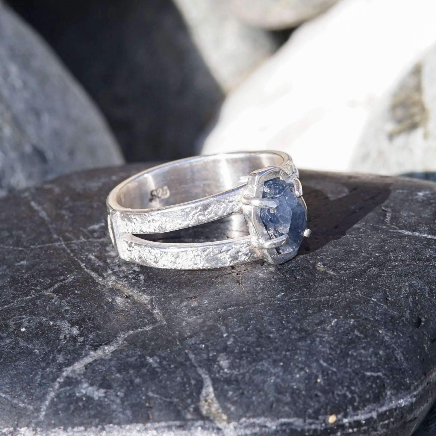 The gem is a beautiful Raw Sapphire and the ring is handcrafted from 925 sterling silver.