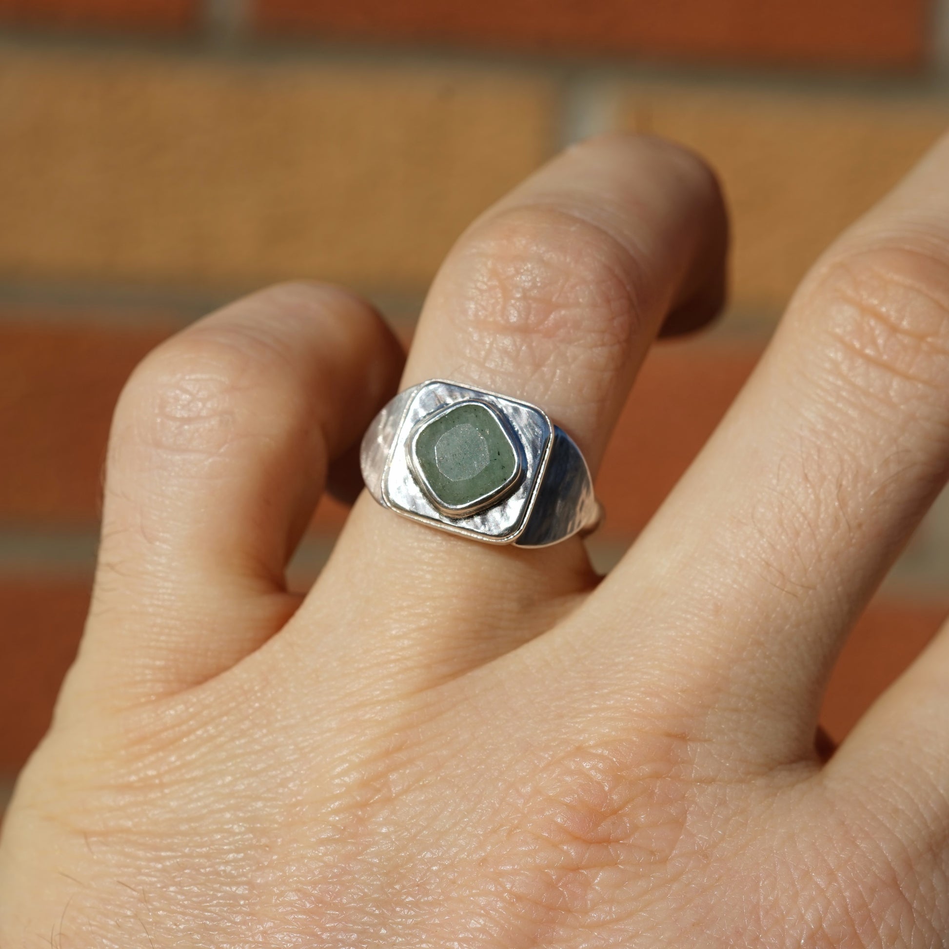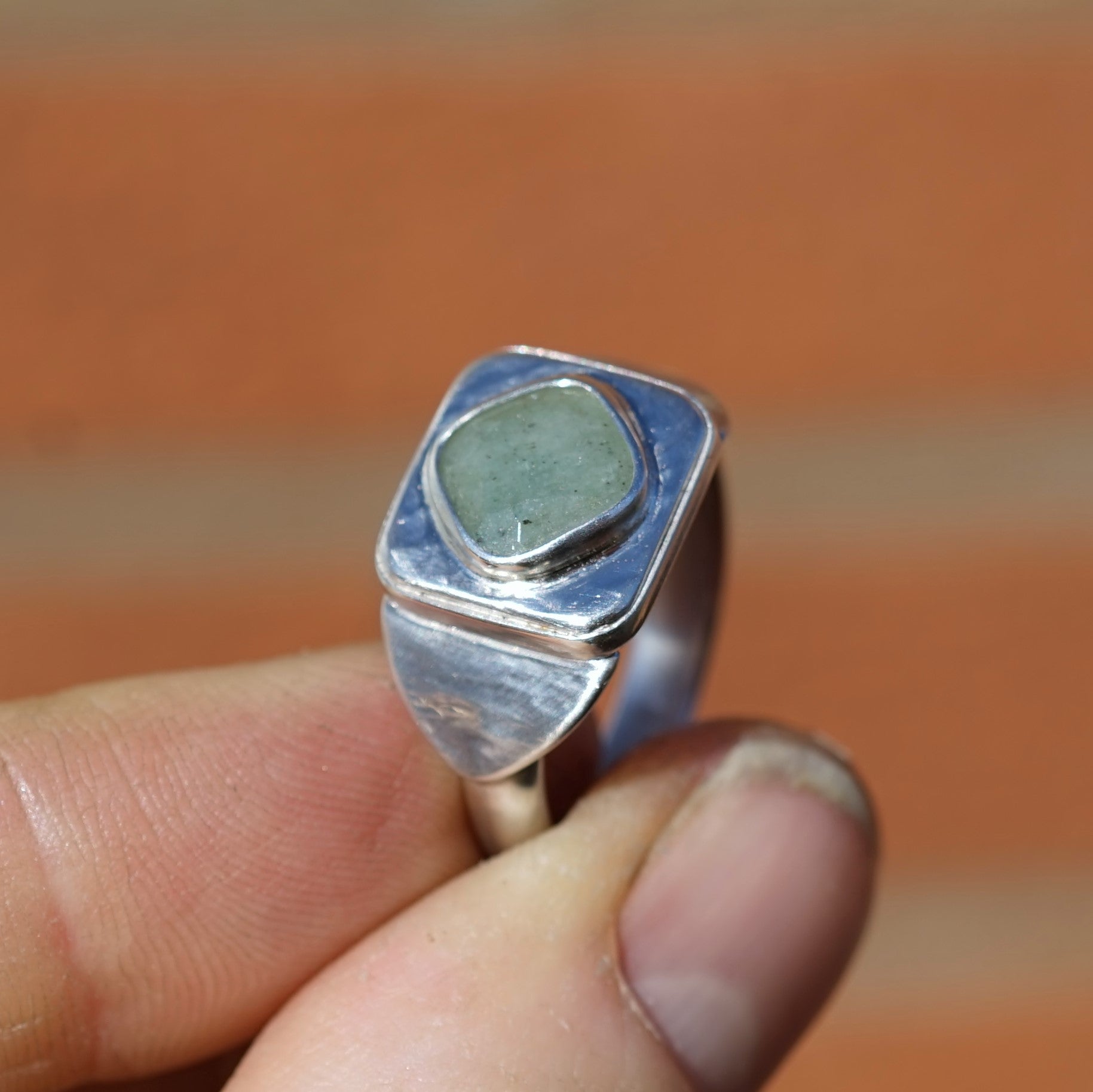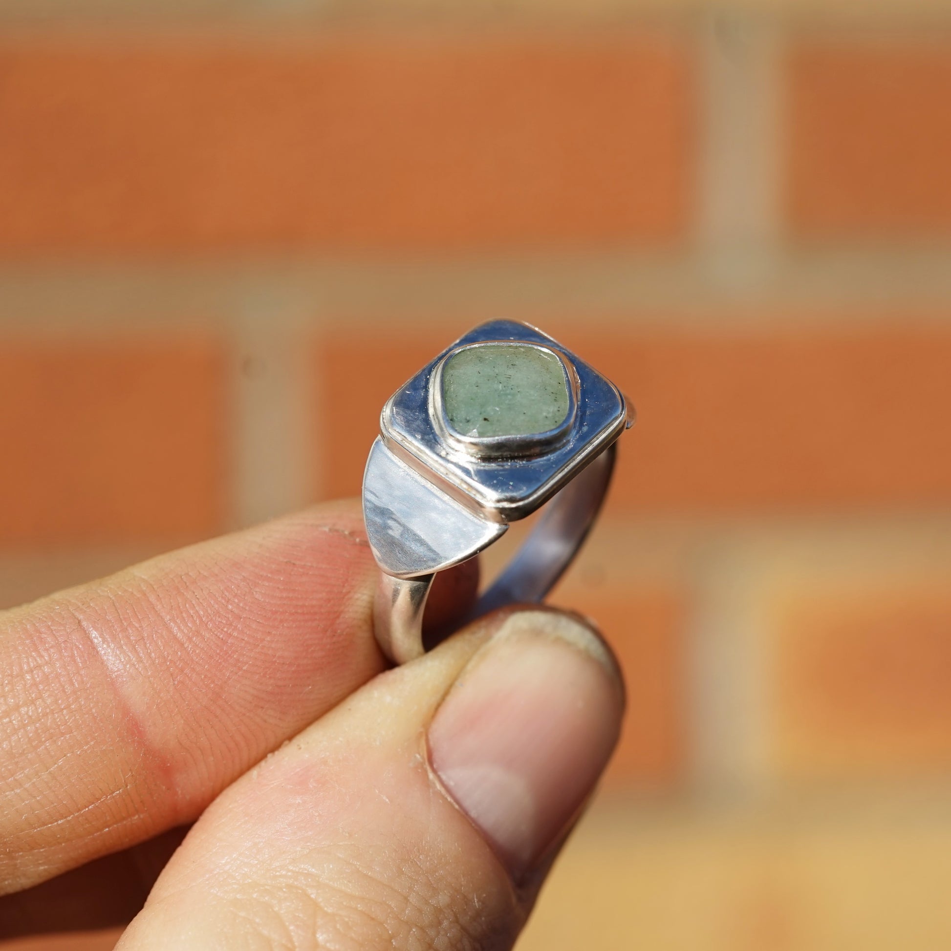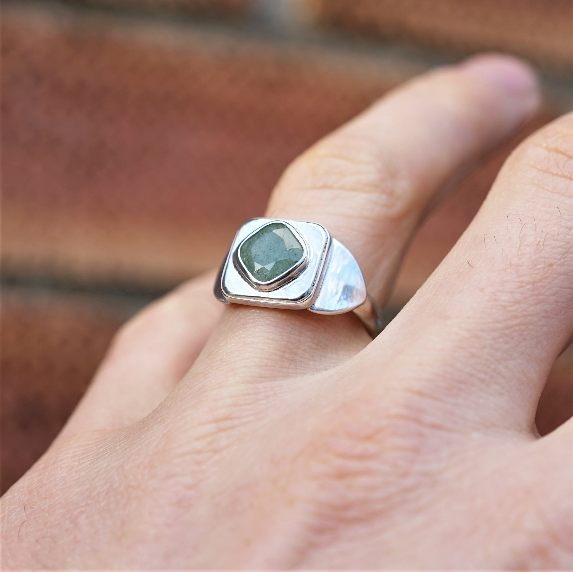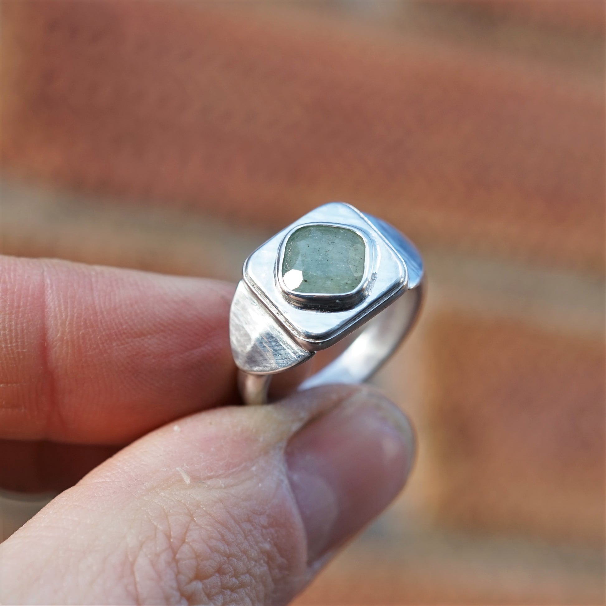 The gem is an Emerald and the ring is hand crafted by me, from 925 Sterling Silver.