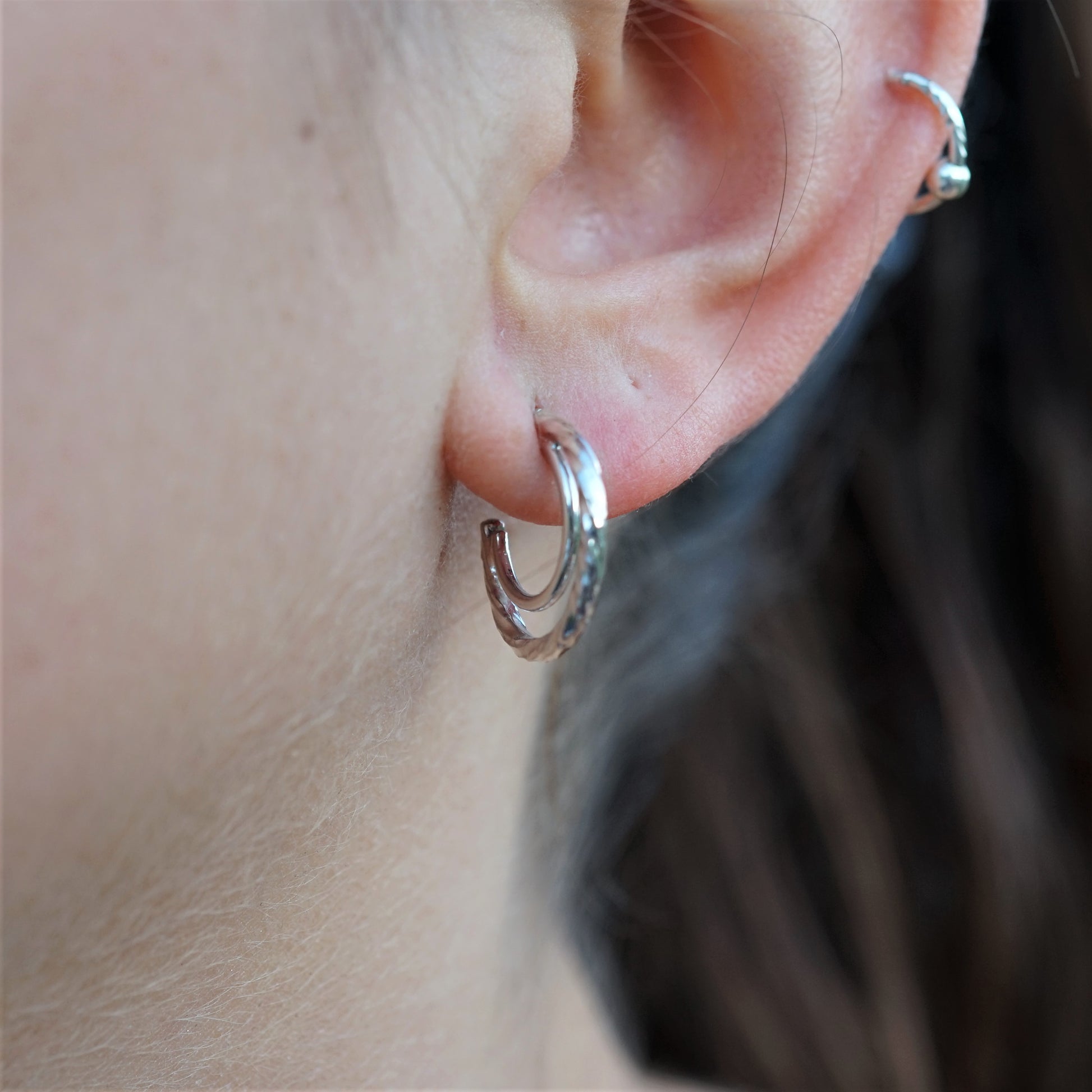 This pair of hoops are made to order and are designed with simplicity in mind but yet have more to offer than meets the eye. The main ring is hammered by me to create the texture.