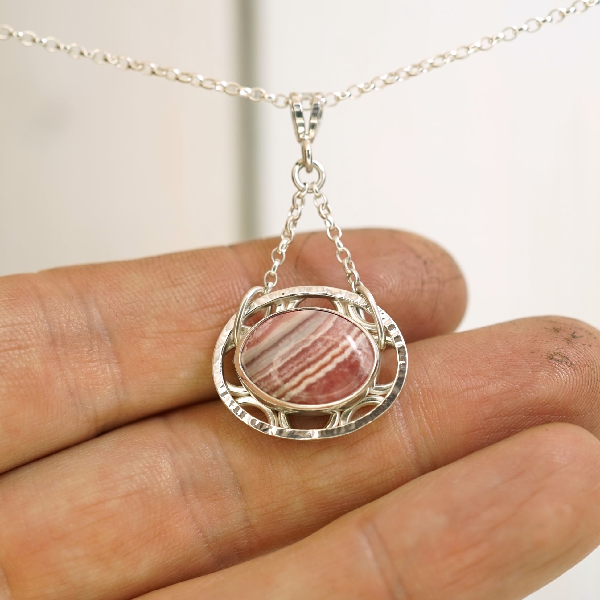 The gem is an Rhodochrosite and the pendant is handcrafted from 925 sterling silver.