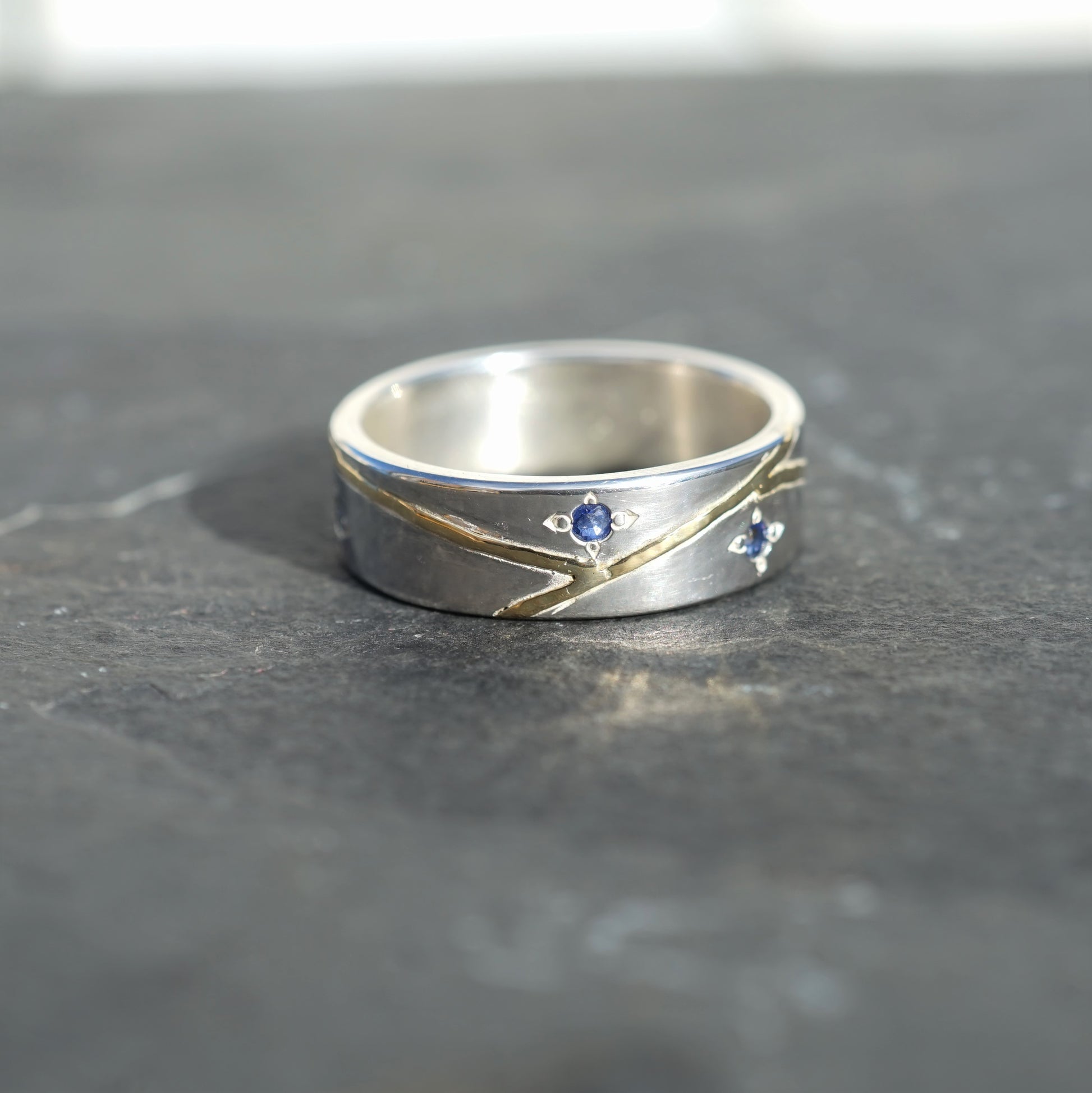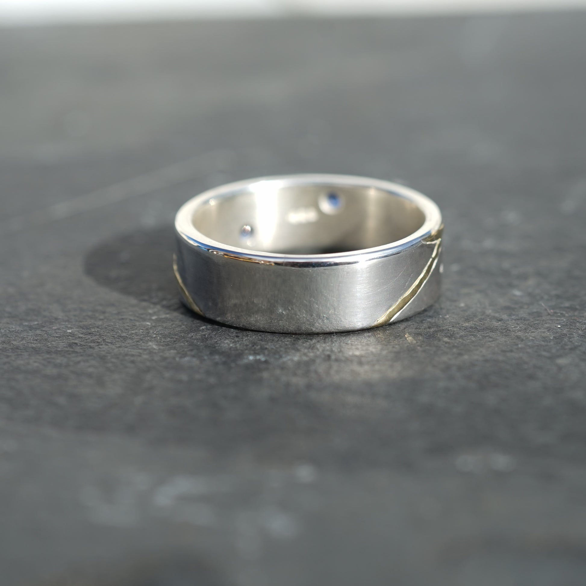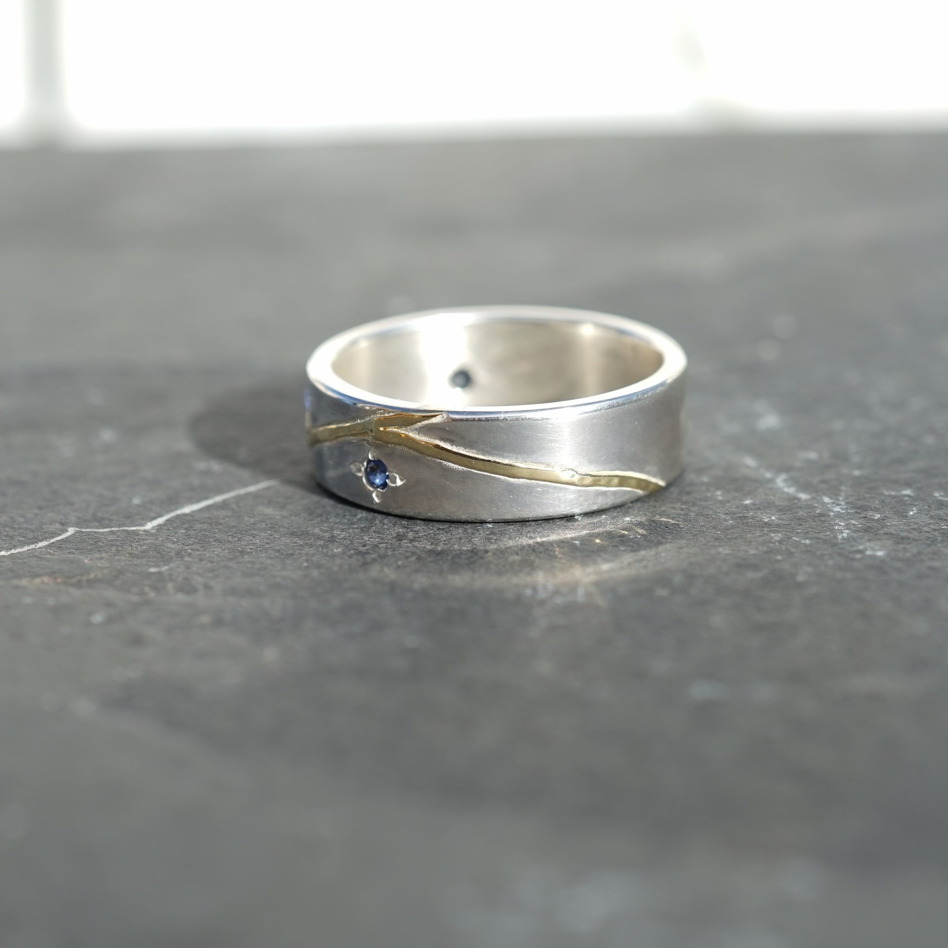 This ring is made from silver with sold 18ct gold inlayed into it, with sapphire set around the top side of the ring.